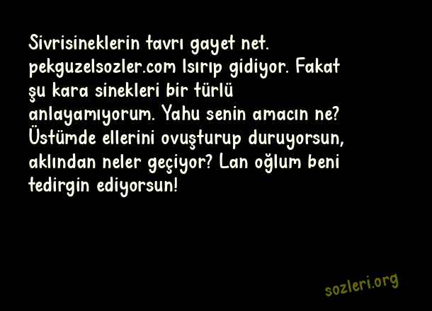 Sivrisineklerin tavrı gayet net. lsırıp gidiyor. Fakat şu kara sinekleri bir türlü anlayamıyorum. Yahu senin amacın ne? Üstümde ellerini ovuşturup duruyorsun, aklından neler geçiyor? Lan oğlum beni tedirgin ediyorsun! ( Sinek İle İlgili Komik Sözler )