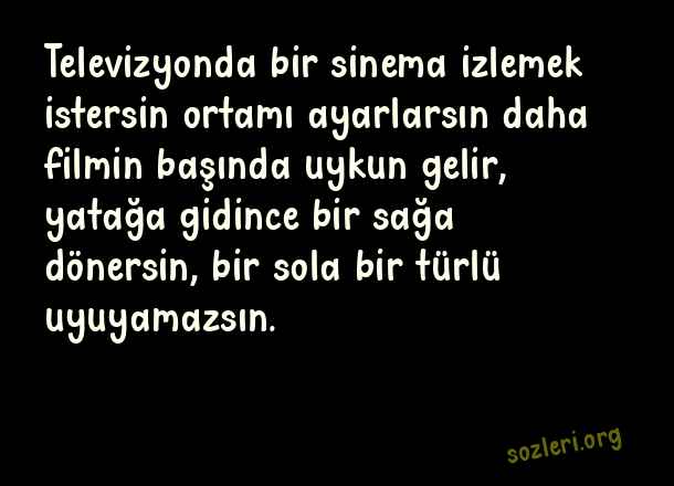 Televizyonda bir sinema izlemek istersin ortamı ayarlarsın daha filmin başında uykun gelir, yatağa gidince bir sağa dönersin, bir sola bir türlü uyuyamazsın. ( Uykuculara Komik Sözler )