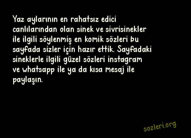 Yaz aylarının en rahatsız edici canlılarından olan sinek ve sivrisinekler ile ilgili söylenmiş en komik sözleri bu sayfada sizler için hazır ettik. Sayfadaki sineklerle ilgili güzel sözleri instagram ve whatsapp ile ya da kısa mesaj ile paylaşın. ( Sinek İle İlgili Komik Sözler )