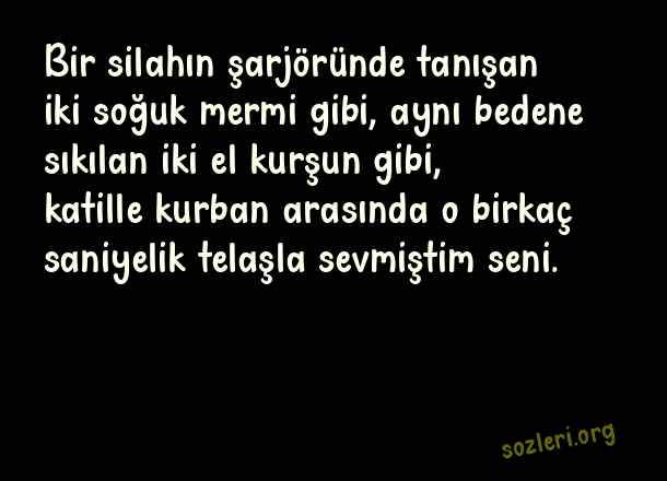 Bir silahın şarjöründe tanışan iki soğuk mermi gibi, aynı bedene sıkılan iki el kurşun gibi, katille kurban arasında o birkaç saniyelik telaşla sevmiştim seni. ( Küçük İskender )