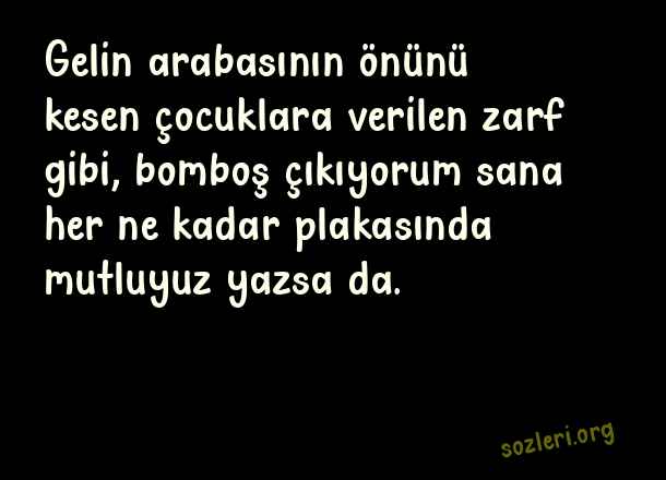 Gelin arabasının önünü kesen çocuklara verilen zarf gibi, bomboş çıkıyorum sana her ne kadar plakasında mutluyuz yazsa da. ( Küçük İskender )