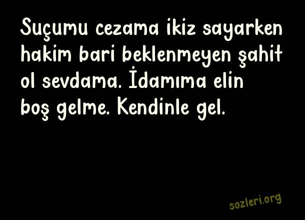 Suçumu cezama ikiz sayarken hakim bari beklenmeyen şahit ol sevdama. İdamıma elin boş gelme. Kendinle gel. ( Küçük İskender )