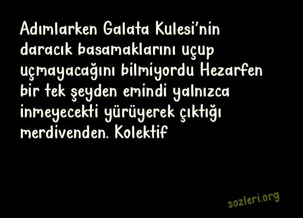 Adımlarken Galata Kulesi’nin daracık basamaklarını uçup uçmayacağını bilmiyordu Hezarfen bir tek şeyden emindi yalnızca inmeyecekti yürüyerek çıktığı merdivenden. Kolektif ( Galata Kulesi )