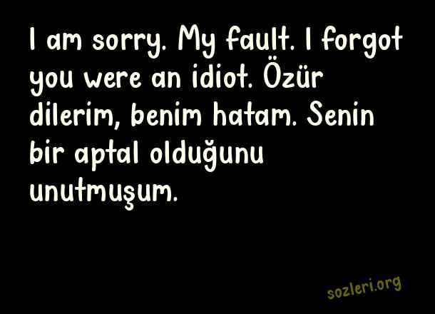 l am sorry. My fault. l forgot you were an idiot. Özür dilerim, benim hatam. Senin bir aptal olduğunu unutmuşum. ( İngilizce Laf Sokucu Sözler )