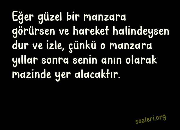 Eğer güzel bir manzara görürsen ve hareket halindeysen dur ve izle, çünkü o manzara yıllar sonra senin anın olarak mazinde yer alacaktır. ( Manzara )