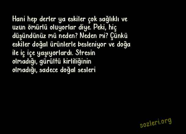 Hani hep derler ya eskiler çok sağlıklı ve uzun ömürlü oluyorlar diye. Peki, hiç düşündünüz mü neden? Neden mi? Çünkü eskiler doğal ürünlerle besleniyor ve doğa ile iç içe yaşıyorlardı. Stresin olmadığı, gürültü kirliliğinin olmadığı, sadece doğal sesleri ( Manzara )