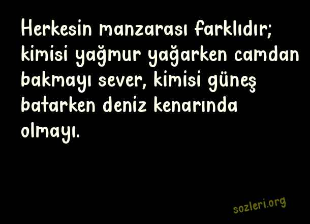 Herkesin manzarası farklıdır; kimisi yağmur yağarken camdan bakmayı sever, kimisi güneş batarken deniz kenarında olmayı. ( Manzara )