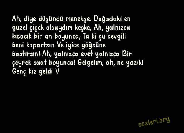 Ah, diye düşündü menekşe, Doğadaki en güzel çiçek olsaydım keşke, Ah, yalnızca kısacık bir an boyunca, Ta ki şu sevgili beni kopartsın Ve iyice göğsüne bastırsın! Ah, yalnızca evet yalnızca Bir çeyrek saat boyunca! Gelgelim, ah, ne yazık! Genç kız geldi V ( Menekşe )