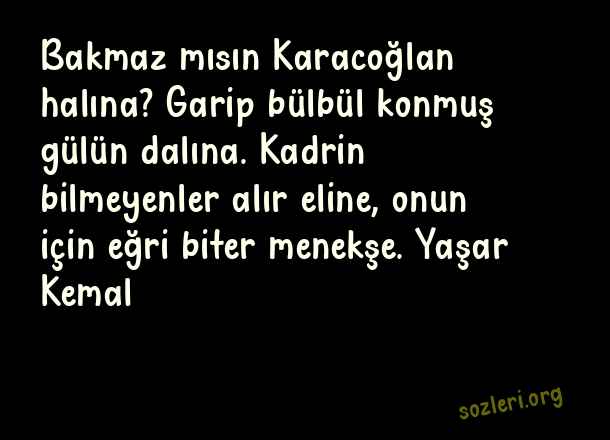 Bakmaz mısın Karacoğlan halına? Garip bülbül konmuş gülün dalına. Kadrin bilmeyenler alır eline, onun için eğri biter menekşe. Yaşar Kemal ( Menekşe )