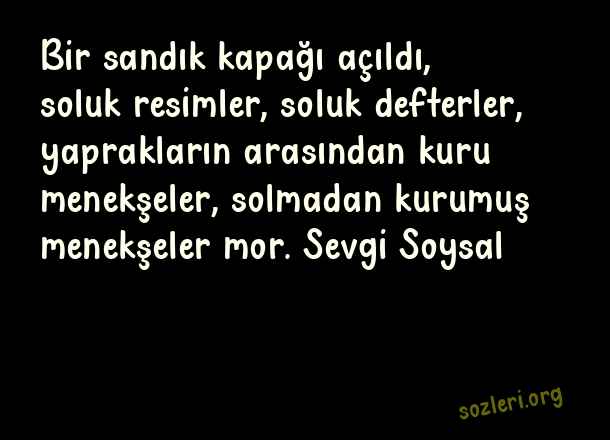 Bir sandık kapağı açıldı, soluk resimler, soluk defterler, yaprakların arasından kuru menekşeler, solmadan kurumuş menekşeler mor. Sevgi Soysal ( Menekşe )