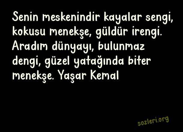 Senin meskenindir kayalar sengi, kokusu menekşe, güldür irengi. Aradım dünyayı, bulunmaz dengi, güzel yatağında biter menekşe. Yaşar Kemal ( Menekşe )