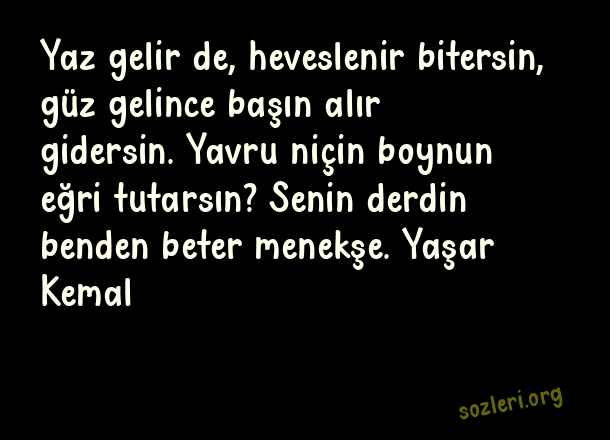 Yaz gelir de, heveslenir bitersin, güz gelince başın alır gidersin. Yavru niçin boynun eğri tutarsın? Senin derdin benden beter menekşe. Yaşar Kemal ( Menekşe )