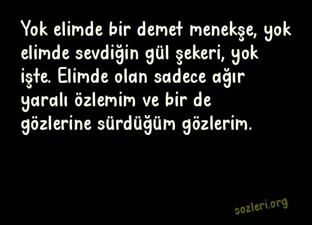 Yok elimde bir demet menekşe, yok elimde sevdiğin gül şekeri, yok işte. Elimde olan sadece ağır yaralı özlemim ve bir de gözlerine sürdüğüm gözlerim. ( Menekşe )