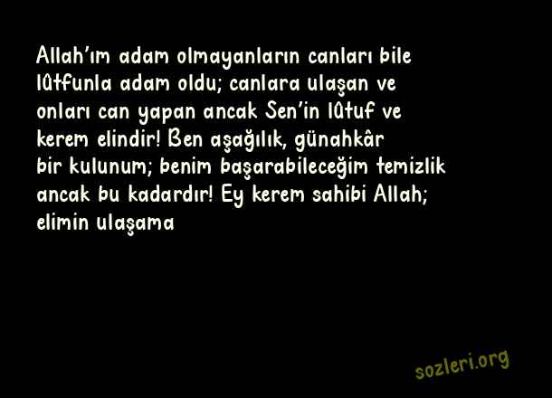 Allah’ım adam olmayanların canları bile lûtfunla adam oldu; canlara ulaşan ve onları can yapan ancak Sen’in lûtuf ve kerem elindir! Ben aşağılık, günahkâr bir kulunum; benim başarabileceğim temizlik ancak bu kadardır! Ey kerem sahibi Allah; elimin ulaşama ( Mesnevi ve Divan-ı Kebir’den Seçme Sözler )