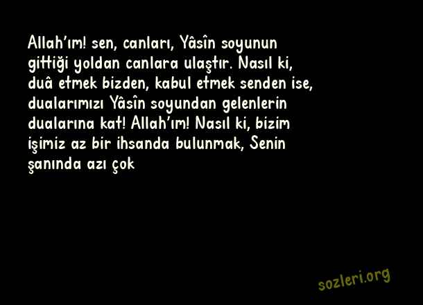 Allah’ım! sen, canları, Yâsîn soyunun gittiği yoldan canlara ulaştır. Nasıl ki, duâ etmek bizden, kabul etmek senden ise, dualarımızı Yâsîn soyundan gelenlerin dualarına kat! Allah’ım! Nasıl ki, bizim işimiz az bir ihsanda bulunmak, Senin şanında azı çok ( Mesnevi ve Divan-ı Kebir’den Seçme Sözler )