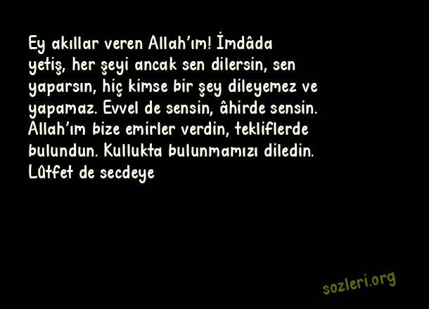 Ey akıllar veren Allah’ım! İmdâda yetiş, her şeyi ancak sen dilersin, sen yaparsın, hiç kimse bir şey dileyemez ve yapamaz. Evvel de sensin, âhirde sensin. Allah’ım bize emirler verdin, tekliflerde bulundun. Kullukta bulunmamızı diledin. Lûtfet de secdeye ( Mesnevi ve Divan-ı Kebir’den Seçme Sözler )