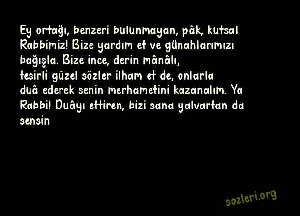 Ey ortağı, benzeri bulunmayan, pâk, kutsal Rabbimiz! Bize yardım et ve günahlarımızı bağışla. Bize ince, derin mânâlı, tesirli güzel sözler ilham et de, onlarla duâ ederek senin merhametini kazanalım. Ya Rabbi! Duâyı ettiren, bizi sana yalvartan da sensin ( Mesnevi ve Divan-ı Kebir’den Seçme Sözler )