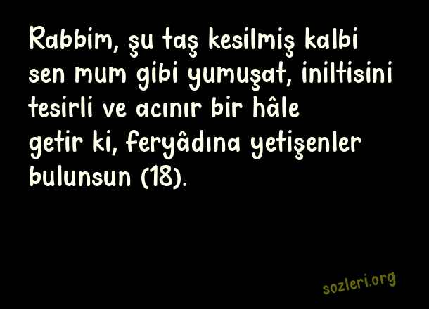 Rabbim, şu taş kesilmiş kalbi sen mum gibi yumuşat, iniltisini tesirli ve acınır bir hâle getir ki, feryâdına yetişenler bulunsun (18). ( Mesnevi ve Divan-ı Kebir’den Seçme Sözler )