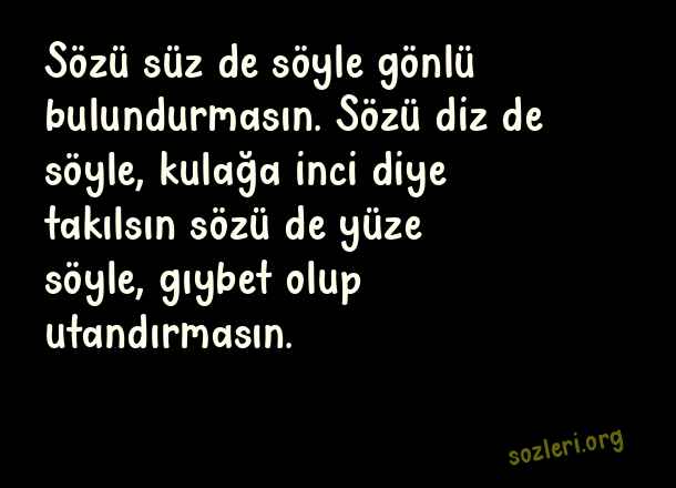 Sözü süz de söyle gönlü bulundurmasın. Sözü diz de söyle, kulağa inci diye takılsın sözü de yüze söyle, gıybet olup utandırmasın. ( Mevlana’dan Derin Sözler )