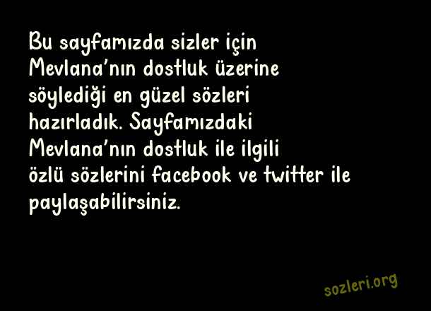 Bu sayfamızda sizler için Mevlana’nın dostluk üzerine söylediği en güzel sözleri hazırladık. Sayfamızdaki Mevlana’nın dostluk ile ilgili özlü sözlerini facebook ve twitter ile paylaşabilirsiniz. ( Mevlana’nın Dostluki )