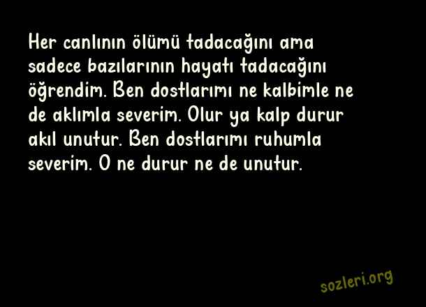 Her canlının ölümü tadacağını ama sadece bazılarının hayatı tadacağını öğrendim. Ben dostlarımı ne kalbimle ne de aklımla severim. Olur ya kalp durur akıl unutur. Ben dostlarımı ruhumla severim. O ne durur ne de unutur. ( Mevlana’nın Dostluki )
