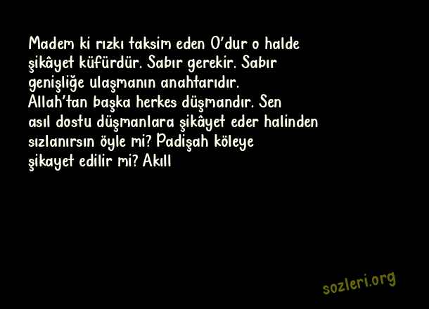 Madem ki rızkı taksim eden O’dur o halde şikâyet küfürdür. Sabır gerekir. Sabır genişliğe ulaşmanın anahtarıdır. Allah’tan başka herkes düşmandır. Sen asıl dostu düşmanlara şikâyet eder halinden sızlanırsın öyle mi? Padişah köleye şikayet edilir mi? Akıll ( Mevlana’nın Dostluki )