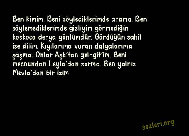 Ben kimim. Beni söylediklerimde arama. Ben söylemediklerimde gizliyim görmediğin koskoca derya gönlümdür. Gördüğün sahil ise dilim. Kıyılarıma vuran dalgalarıma şaşma. Onlar Aşk’tan gel-git’im. Beni mecnundan Leyla’dan sorma. Ben yalnız Mevla’dan bir izim ( Mevlana Aşk )