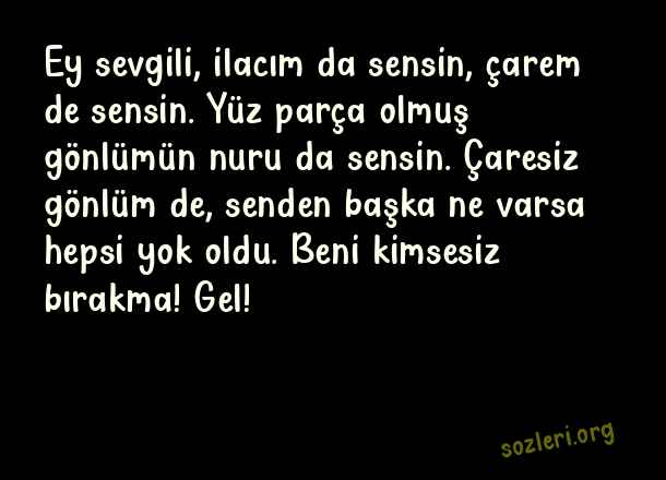 Ey sevgili, ilacım da sensin, çarem de sensin. Yüz parça olmuş gönlümün nuru da sensin. Çaresiz gönlüm de, senden başka ne varsa hepsi yok oldu. Beni kimsesiz bırakma! Gel! ( Mevlana Aşk )