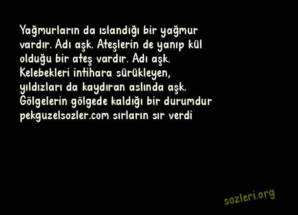 Yağmurların da ıslandığı bir yağmur vardır. Adı aşk. Ateşlerin de yanıp kül olduğu bir ateş vardır. Adı aşk. Kelebekleri intihara sürükleyen, yıldızları da kaydıran aslında aşk. Gölgelerin gölgede kaldığı bir durumdur sırların sır verdi ( Mevlana Aşk )