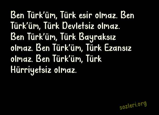 Ben Türk’üm, Türk esir olmaz. Ben Türk’üm, Türk Devletsiz olmaz. Ben Türk’üm, Türk Bayraksız olmaz. Ben Türk’üm, Türk Ezansız olmaz. Ben Türk’üm, Türk Hürriyetsiz olmaz. ( Muhsin Yazıcıoğlu )