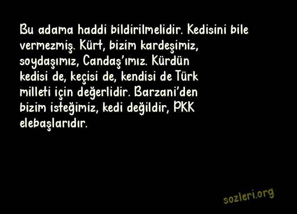 Bu adama haddi bildirilmelidir. Kedisini bile vermezmiş. Kürt, bizim kardeşimiz, soydaşımız, Candaş’ımız. Kürdün kedisi de, keçisi de, kendisi de Türk milleti için değerlidir. Barzani’den bizim isteğimiz, kedi değildir, PKK elebaşlarıdır. ( Muhsin Yazıcıoğlu )