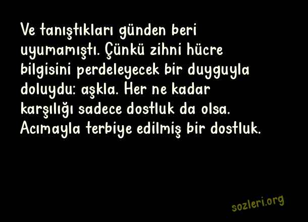Ve tanıştıkları günden beri uyumamıştı. Çünkü zihni hücre bilgisini perdeleyecek bir duyguyla doluydu: aşkla. Her ne kadar karşılığı sadece dostluk da olsa. Acımayla terbiye edilmiş bir dostluk. ( Mükemmel Aşk )
