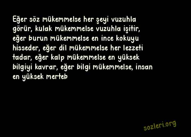 Eğer söz mükemmelse her şeyi vuzuhla görür, kulak mükemmelse vuzuhla işitir, eğer burun mükemmelse en ince kokuyu hisseder, eğer dil mükemmelse her lezzeti tadar, eğer kalp mükemmelse en yüksek bilgiyi kavrar, eğer bilgi mükemmelse, insan en yüksek merteb ( Mükemmellik )