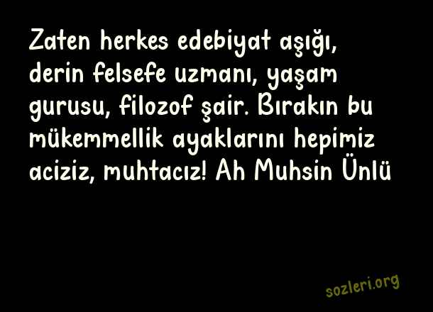 Zaten herkes edebiyat aşığı, derin felsefe uzmanı, yaşam gurusu, filozof şair. Bırakın bu mükemmellik ayaklarını hepimiz aciziz, muhtacız! Ah Muhsin Ünlü ( Mükemmellik )