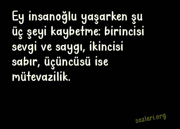 Ey insanoğlu yaşarken şu üç şeyi kaybetme: birincisi sevgi ve saygı, ikincisi sabır, üçüncüsü ise mütevazilik. ( Mütevazi Sözler )