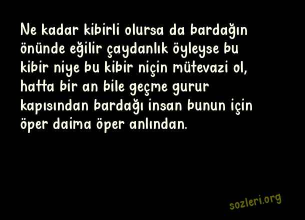 Ne kadar kibirli olursa da bardağın önünde eğilir çaydanlık öyleyse bu kibir niye bu kibir niçin mütevazi ol, hatta bir an bile geçme gurur kapısından bardağı insan bunun için öper daima öper anlından. ( Mütevazi Sözler )