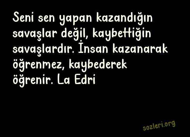 Seni sen yapan kazandığın savaşlar değil, kaybettiğin savaşlardır. İnsan kazanarak öğrenmez, kaybederek öğrenir. La Edri ( Mütevazi Sözler )