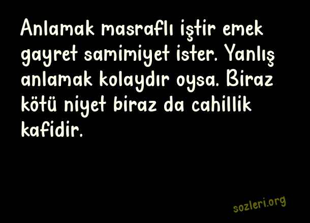 Anlamak masraflı iştir emek gayret samimiyet ister. Yanlış anlamak kolaydır oysa. Biraz kötü niyet biraz da cahillik kafidir. ( Naif Sözler )