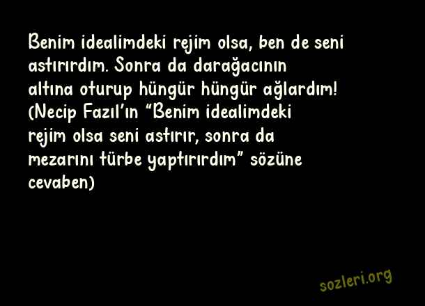 Benim idealimdeki rejim olsa, ben de seni astırırdım. Sonra da darağacının altına oturup hüngür hüngür ağlardım! (Necip Fazıl’ın “Benim idealimdeki rejim olsa seni astırır, sonra da mezarını türbe yaptırırdım” sözüne cevaben) ( Nazım Hikmet )