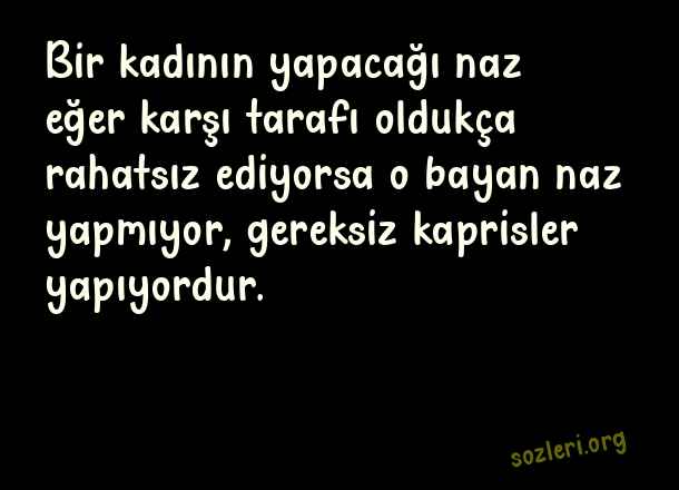 Bir kadının yapacağı naz eğer karşı tarafı oldukça rahatsız ediyorsa o bayan naz yapmıyor, gereksiz kaprisler yapıyordur. ( Naz )