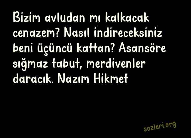 Bizim avludan mı kalkacak cenazem? Nasıl indireceksiniz beni üçüncü kattan? Asansöre sığmaz tabut, merdivenler daracık. Nazım Hikmet ( Cenaze )