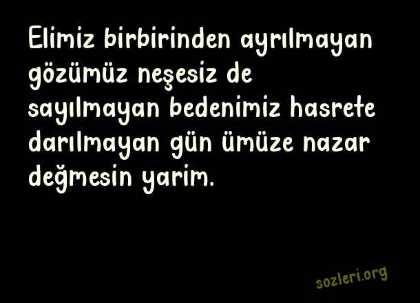 Elimiz birbirinden ayrılmayan gözümüz neşesiz de sayılmayan bedenimiz hasrete darılmayan gün ümüze nazar değmesin yarim. ( Nazar )