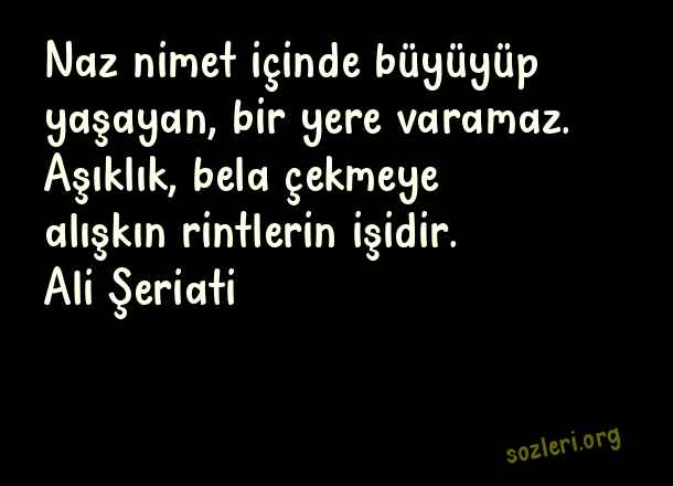 Naz nimet içinde büyüyüp yaşayan, bir yere varamaz. Aşıklık, bela çekmeye alışkın rintlerin işidir. Ali Şeriati ( Naz )