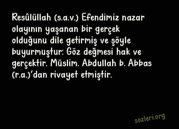 Resûlüllah (s.a.v.) Efendimiz nazar olayının yaşanan bir gerçek olduğunu dile getirmiş ve şöyle buyurmuştur: Göz değmesi hak ve gerçektir. Müslim. Abdullah b. Abbas (r.a.)’dan rivayet etmiştir. ( Nazar )