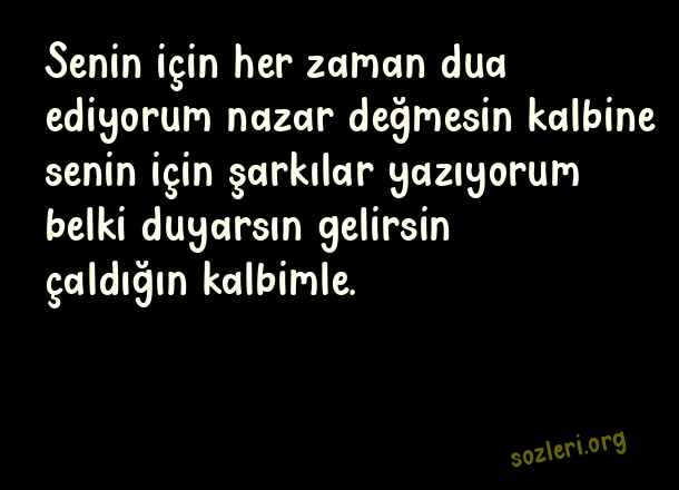 Senin için her zaman dua ediyorum nazar değmesin kalbine senin için şarkılar yazıyorum belki duyarsın gelirsin çaldığın kalbimle. ( Nazar )