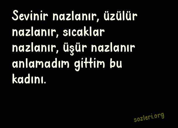 Sevinir nazlanır, üzülür nazlanır, sıcaklar nazlanır, üşür nazlanır anlamadım gittim bu kadını. ( Naz )