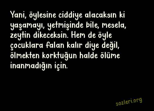Yani, öylesine ciddiye alacaksın ki yaşamayı, yetmişinde bile, mesela, zeytin dikeceksin. Hem de öyle çocuklara falan kalır diye değil, ölmekten korktuğun halde ölüme inanmadığın için. ( Nazım Hikmet )