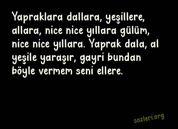 Yapraklara dallara, yeşillere, allara, nice nice yıllara gülüm, nice nice yıllara. Yaprak dala, al yeşile yaraşır, gayri bundan böyle vermem seni ellere. ( Nazım Hikmet )