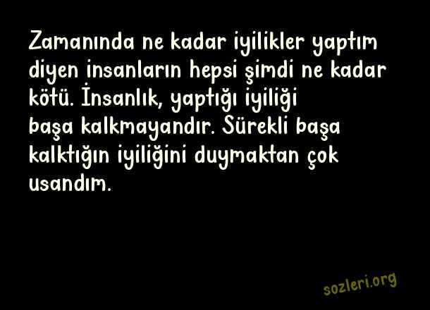 Zamanında ne kadar iyilikler yaptım diyen insanların hepsi şimdi ne kadar kötü. İnsanlık, yaptığı iyiliği başa kalkmayandır. Sürekli başa kalktığın iyiliğini duymaktan çok usandım. ( Naz )