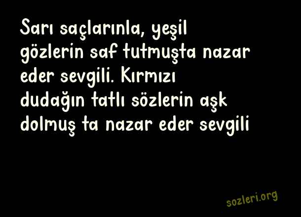 Sarı saçlarınla, yeşil gözlerin saf tutmuşta nazar eder sevgili. Kırmızı dudağın tatlı sözlerin aşk dolmuş ta nazar eder sevgili ( Nazar )